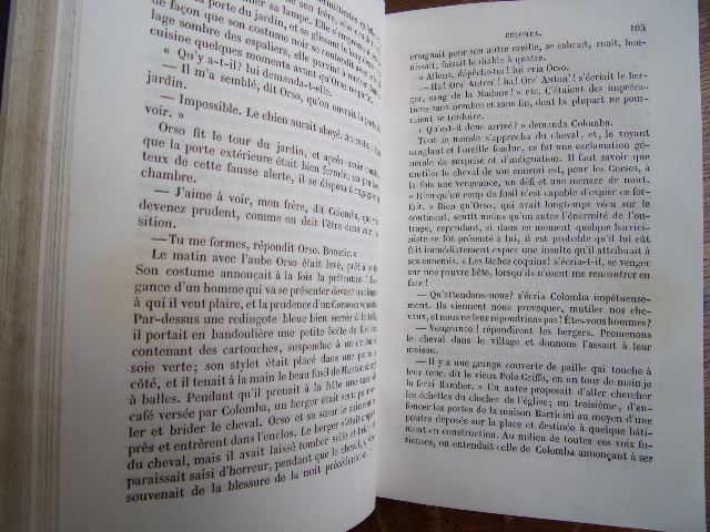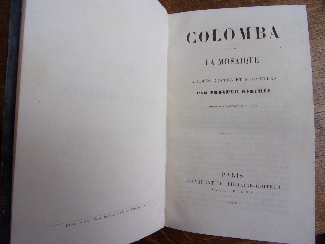 table, Colombas - La vénus d'ille - les âmes du purgatoire - mateo Falcone - Visions de Charles XI - L' enlèvement de la redoute - Tamango - La perle de Tolède - La partie de Trictrac - Le vase étrusque - Les mécontents - lettres adressées d'Espagne. Complet, volume relié, 180x120, très bel état intérieur, 450pp. Paris, Charpentier, 1858 ref/180