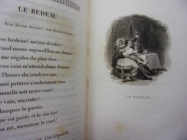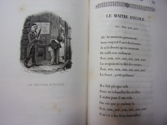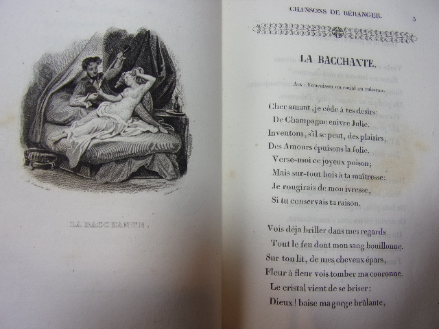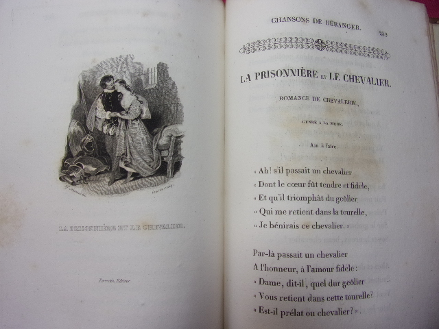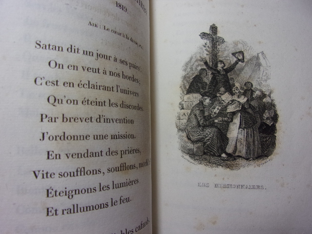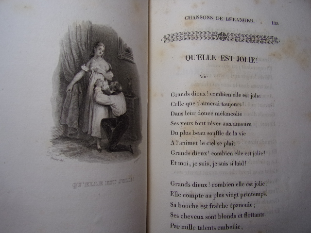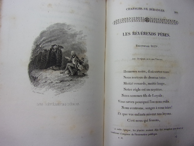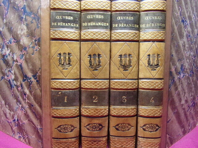ŒUVRES COMPLÈTES DE BERANGER ( Pierre Jean de.) édition unique revue par l'auteur, ornée de 104 vignettes en taille douce dessinées par les peintres les plus célèbres. vols reliés, in8, 220x140, demi basane brune, jolies reliures, bel état intérieur, coins émoussés. Première édition complète de tout ce qui a paru en 1834. 4 tomes : Tome 1 : 2 Portraits en frontispice de Béranger, préface de l'auteur, notice, chansons. 320 pages. Tome 2 : préface 1815, conversation entre mon censeur et moi, chansons. 413 pages. Tome 3 : 411 pages - Tome 4 : chansons, procès faits au chansons de M.P. de Béranger. 397 pages Édition complète en soi. Portrait en frontispice dont le 2e gravé par Lacoste + fac similé d'une lettre. qq rousseurs, bon état. Paris Perrotin 1834 ref/90