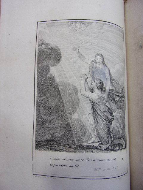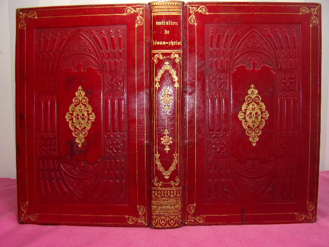 Paris, Garnier Frères, Libraires-Éditeurs, 1865 ; in-4, 4-660 pp. + frontispice en couleurs, 9 pl. hors-texte, relié demi-chagrin rouge, dos orné à nerfs (nombreuses rousseurs). Nouvelle édition. Traduction et réflexions à la fin de chaque chapitre. Illustrations hors-texte sur acier, avec frise, page de texte entourée d'une frise de couleurs bistre, lettres ornées, culs-de-lampe. L'Imitation de Jésus-Christ (en latin 'de imitatione Christi') est une oeuvre anonyme de piété chrétienne de la fin du XIVème siècle ou du début du XVème siècle. On estime actuellement que son auteur est Thomas a Kempis. Bon état.