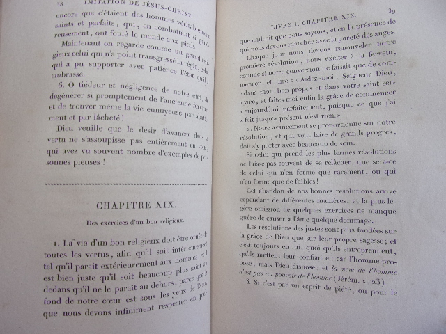 traduction nouvelle avec des réflexions à la fin de chaque chapitre et précédée de prières pendant la messe vol relié demi cuir, in12, 170x130, frottements, bon état int. 549pp Paris. Edme & Picard 1839 Abbé Félicité de La Mennais était un prêtre catholique français et un écrivain religieux du XIXe siècle. Il est connu pour son rôle dans le mouvement du catholicisme libéral et pour son engagement en faveur de la liberté religieuse et de la démocratie. Il s'agit de son adaptation de "L'Imitation de Jésus-Christ". "L'Imitation de Jésus-Christ" est un livre de dévotion qui vise à guider les lecteurs dans leur vie spirituelle en s'inspirant de l'exemple de Jésus-Christ. Il explore des thèmes tels que la piété, la humilité, l'obéissance, la renonciation aux plaisirs terrestres, la prière et la contemplation de la vie de Jésus. L'ouvrage est divisé en plusieurs chapitres ou courts textes qui abordent différents aspects de la vie chrétienne. Il encourage les lecteurs à se rapprocher de Dieu, à cultiver la vertu et à vivre une vie centrée sur l'amour et le service envers les autres. "L'Imitation de Jésus-Christ" a été traduit dans de nombreuses langues et a été largement lu et étudié par des chrétiens du monde entier. Il continue d'être une source d'inspiration pour de nombreux croyants et reste une référence majeure de la spiritualité chrétienne. ref/c85