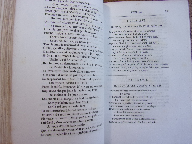 1 vol. grand in-8 reliure de l'époque demi-chagrin à coins bordeaux, dos à 4 nerfs dorés, triple filet doré en mors et coins, initiales L. G. au dos en queue, J.-J. Dubochet et Cie, Paris, 1842, XX-292 pp. avec 80 planches hors texte. Titre complet : Fables de Florian illustrées par J. J. Grandville, suivies de Tobie et de Ruth, Poèmes tirés de l'Ecriture Sainte, et précédées d'une notice sur la Vie et les Ouvrage de Florian par P.-J. Stahl [ Premier Tirage ]