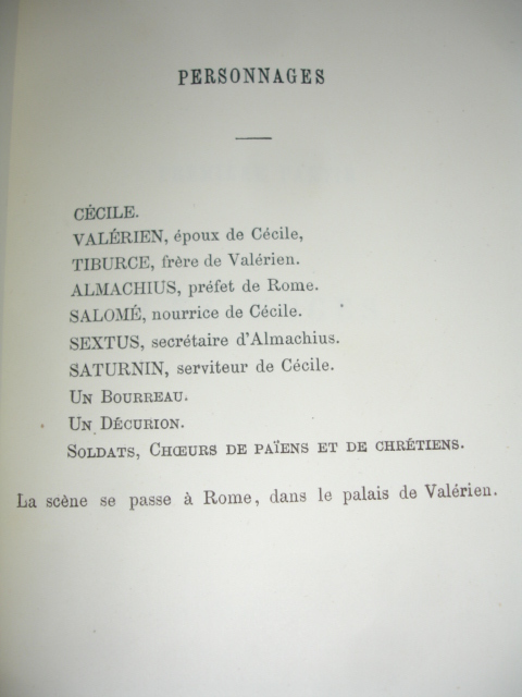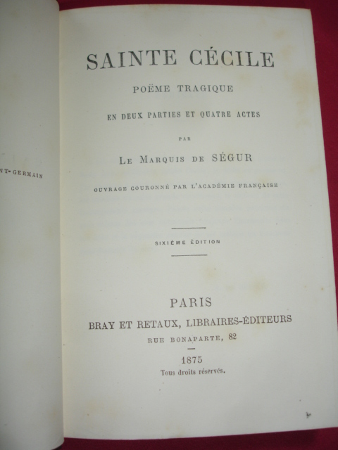 SAINTE CÉCILE, poème tragique en deux parties et quatre actes par Le Marquis DE SÉGUR. vol. 165x110, demi reliure d’époque chagrin marron à coins, qq frottements, toutes tranches dorées, 201 pages, bien frais, bel exemplaire. Chez Victor Retaux, libraire-éditeur, Paris, 1875