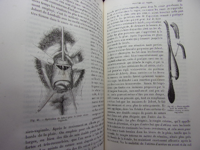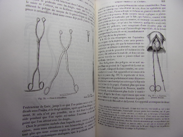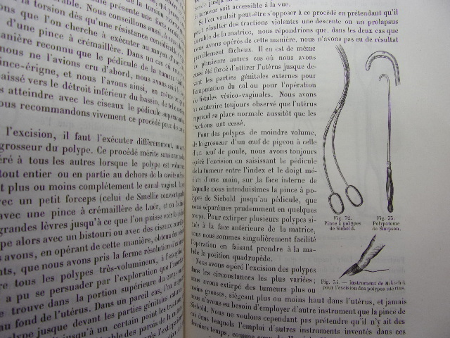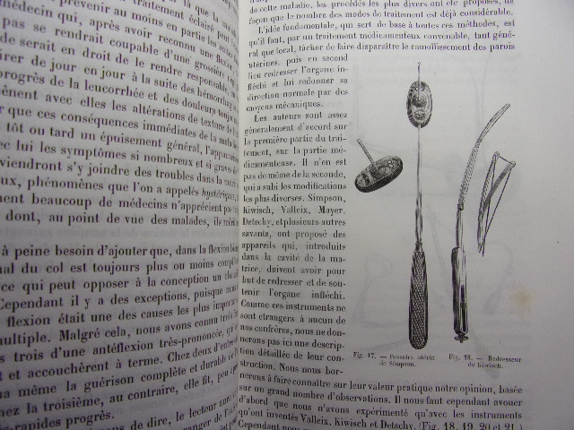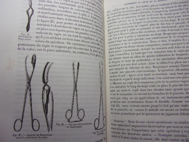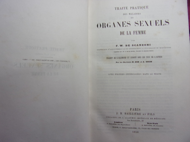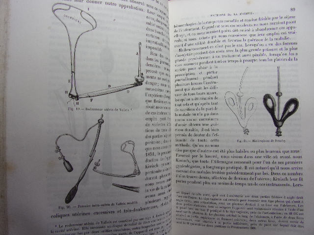 avec figures intercalées dans le texte Table; Pathologie et thérapeutique des maladies de l'utérus - des ligaments de l'utérus - des maladies des trompes utérines - des maladies des ovaires - des affections du vagin - des organes génitaux externes - des maladies du sein. volume relié demi cuir, grand in8, 220x140, bel état, 566pp. Peu courant. Paris, Baillière & fils, 1858. Edition Originale. ref/216