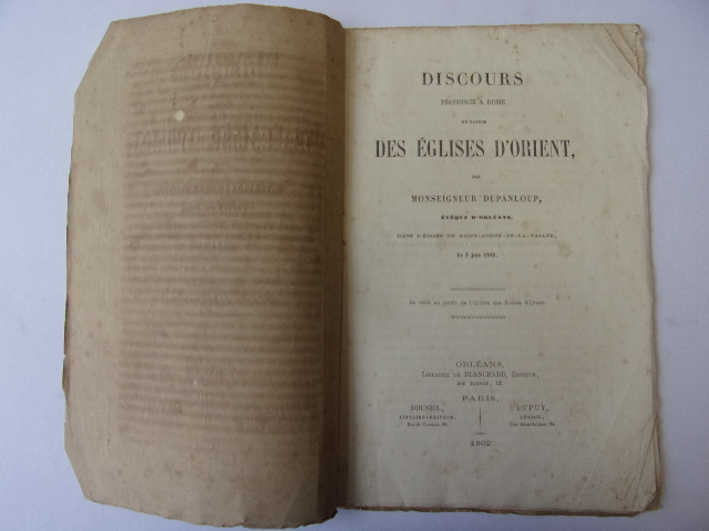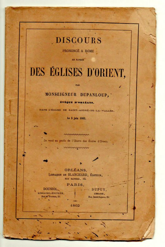 Mgr Dupanloup, Évêque d'Orléans, dans l’Église de Saint-André-de-le-Vallée le 3 juin 1862 brochure sous couvertures, petites usures, bon état intérieur, 26x16, 32 pages. Orléans - Paris - Librairie Blanchard, Douniol Libraire-Editeur et Dupuy Libraire Bon état ref/11