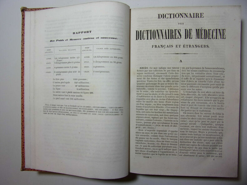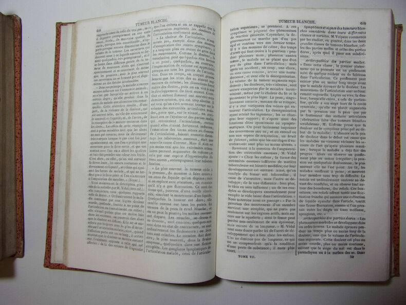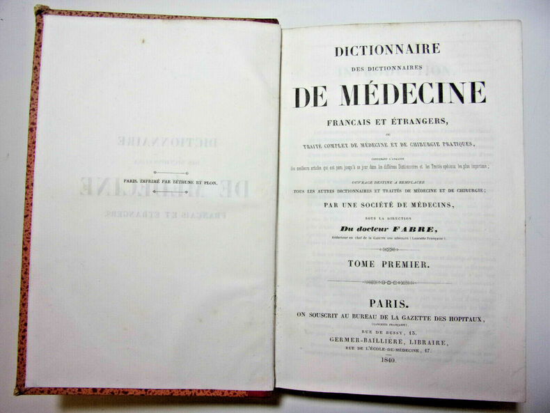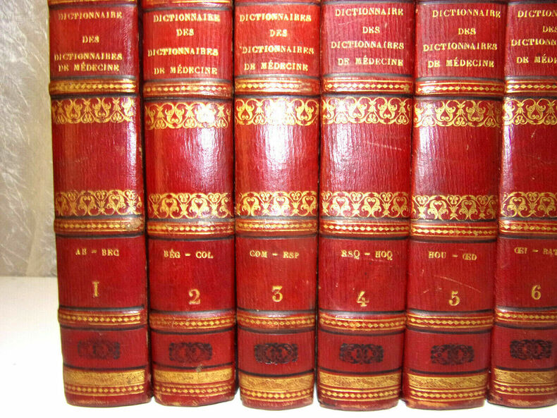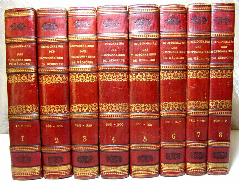 Germer-Baillière, Libraire, rue de l'Ecole-de-médecine, 17 Relié 1840 Sept volumes in-8 (15,2 x 23 cm), reliures demi-peau, dos lisses ornés de dorures, 8 tomes en 7 volumes, très belle reliure d'époque, Dictionnaire des dictionnaires de médecine français et étrangers, ou Traité complet de médecine et de chirurgie pratiques, contenant l'analyse des meilleurs articles qui ont paru jusqu'à ce jour dans les différens Dictionnaires et les Traités spéciaux les plus importans ; ouvragé destiné à remplacer tous les autres dictionnaires et traités de médecine et de chirurgie ; par une société de médecins, sous la direction du Docteur Fabre, rédacteur en chef de la Gazette des Hôpitaux ; coiffes et coins légèrement frottés, par ailleurs bel état général. Livraison a domicile (La Poste) ou en Mondial Relay sur simple demande.