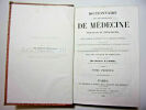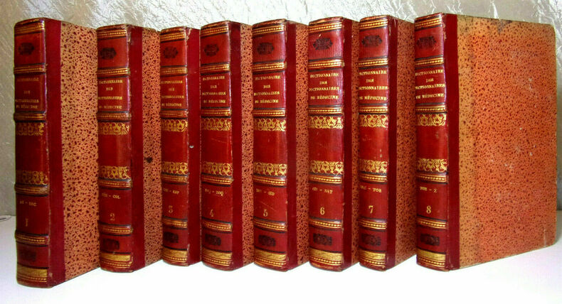 Paris, Au Bureau de la Gazette des Hôpitaux, 1840-1841, 150x220mm, élégante demi-basane du temps, pièce de titre, dos orné, plats racinés, Complet en 8 volumes pour le dictionnaire. Manque le volume de supplément qui parut postérieurement. Intérieur frais hormis de pâles rousseurs sur certaines pages. Les volumes ont été reliés sans les pages de titre et de faux-titre.