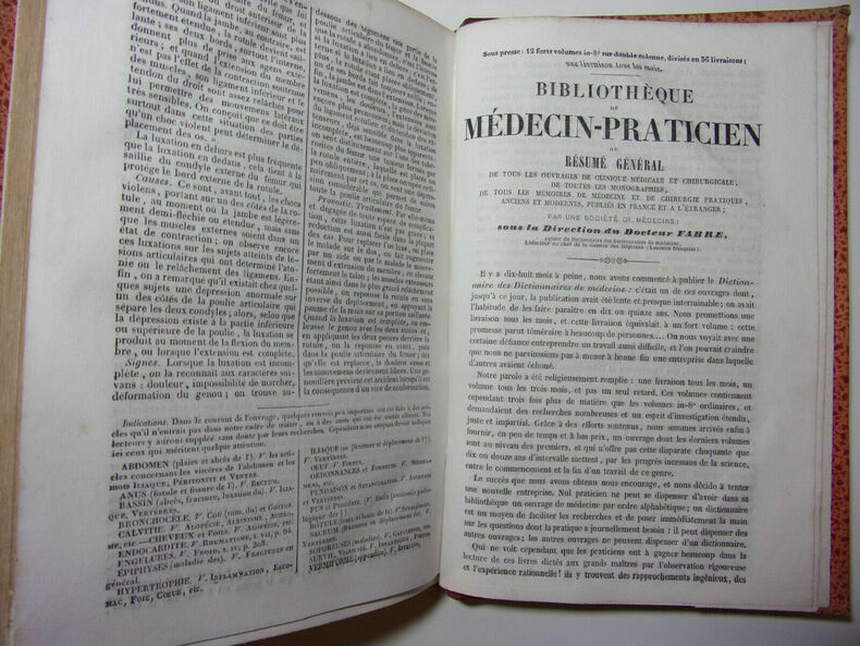ou traité complet de médecine et de chirurgie pratiques, contenant l' analyse des meilleurs articles qui ont parus à ce jour dans les différents dictionnaires et les traités spéciaux les plus importants Par une société de médecins, sous la direction du Docteur Fabre, Directeur en Chef de la gazette des Hôpitaux Complet en 8 vols, reliés demi chagrin, grand-in, 225x150, dos à nerfs, bien frais ( rousseurs sur qq cahiers), bien complet, poids 5,650kg Beaux exemplaires, rare ! Paris Germer-Baillière, 1840