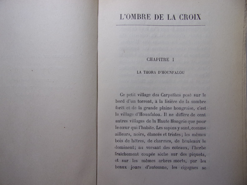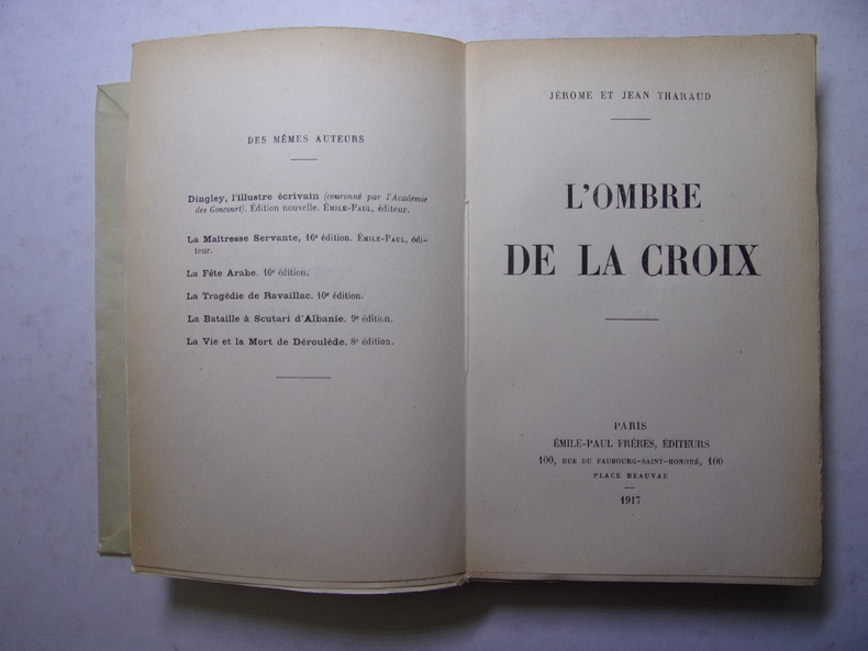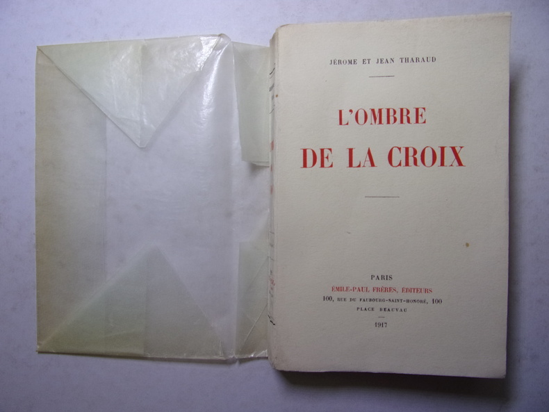 Dans l'oeuvre abondante des frères Tharaud qui exalte un certain nombre de valeurs liées au colonialisme et à l'assurance de la supériorité de la civilisation occidentale, deux mondes principaux servent de cadre : le Maroc et l'Israël. C'est à ce dernier pays que se rattache ce roman. Résumé: peu avant Roch-ha-chana Amram Trébitz, commerçant avisé, quitte Hounfalou, petit village de Hongrie, pour aller passer commande d'une Thora au nom de sa communauté. Sa destination : Bels, en Pologne, où réside Eljé Lébowitz, le fameux Sofer (scribe). Les fêtes passées, Amram Trébitz revient à Hounfalou, nanti d'un époux pour sa fille unique, Guitelé : Hertz Wolf, le fils du scribe. Outre la dot, Amram Trébitz a promis d'entretenir le ménage : pendant trois ans, Hertz Wolf pourra entièrement se consacrer à l'étude de la Loi. De cette union naîtra, tardivement, un fils, Ruben, qu'un pacte tragique va unir à son grand-père le Sofer. Après avoir frôlé la mort à la suite d'une mystérieuse maladie contractée au pied d'un calvaire, Ruben part vivre avec Eljé Lébowitz qui veut en faire l'héritier de son art. - Selon le scribe, l'enfant a payé la faute d'Amram Trébitz, qui a fini par mettre son gendre au travail et l'a détourné de l'Etude. La vie passe, rythmée par la succession des fêtes. Le Sofer se préoccupe du texte saint, l'enfant s'étiole, retombe malade. Le jour du Kippour, au moment de sonner le schofar qui annonce la fin du jeûne, le grand-père, perturbé, oublie qu'il est le porte-voix de la communauté et se laisse aller à son inquiétude - son petit-fils... Tombé malade à son tour, le Sofer sera sauvé par les psaumes récités par les plus observants des juifs d'Hounfalou, les remèdes du médecin et le don sublime de son petit-fils. Ruben a recueilli des dons en unité d'existence auprès des membres de la communauté pour le compte de son grand-père ; lui, s'est porté sans limite sur la liste. Le Sofer recouvre la santé pendant que Ruben s'éteint discrètement. Dans L'Ombre de la Croix, les frères Tharaud racontent la vie de juifs de shtetl, pieds dans la boue, tête dans les nuées et langue bien pendue. Vie pittoresque, toujours en voie d'être déracinée : menacée par les persécutions, la difficulté à tenir l'équilibre entre le Ciel et le Monde, et l'appel de ce qui l'entoure - le christianisme, l'étranger, la modernité... L'Ombre de la Croix a été publié en 1917. bel exemplaire sur papier à grandes marges, non rognées. Exemplaire sur Papier Lafuma n° 475 vol in-8, 200x140, relié demi cuir à coins, très bel état intérieur, tranche de tête dorée, 306pp. Couvertures d'origines conservées avec dos. Paris, Plon, Nourrit 1920 ref/145