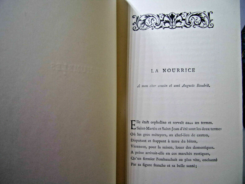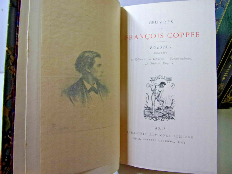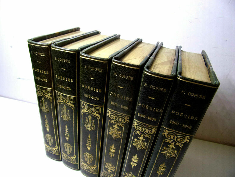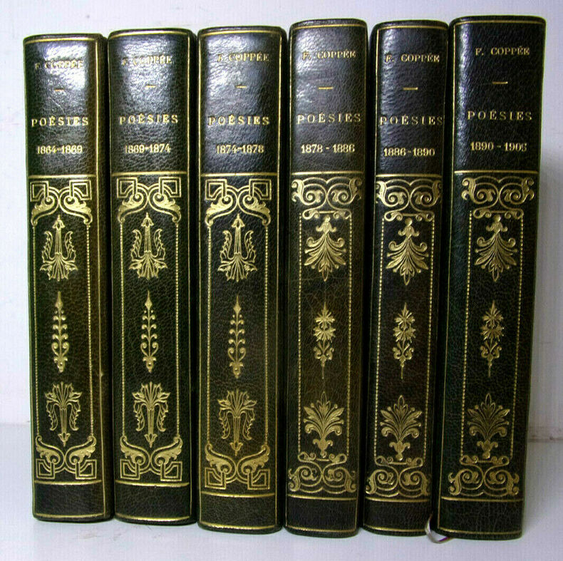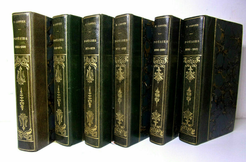 Tome I : Poésies 1864-1869 : Le Reliquaire - Intimités - Poèmes modernes - La Grève des Forgerons ; Tome II : 1869-1874 : Les Humbles - Écrit pendant le Siège - Plus de Sang - Promenades et Intérieurs - Le Cahier rouge ; Tome III : 1874-1878 : Olivier - Les Récits et les Élégies ; Tome IV : 1878-1886 : Contes en vers et Poésies diverses ; Tome V : 1886-1890 : Arrière-Saison - Les Paroles sincères ; Tome VI : Poésies 1890-1905 : Dans la Prière et dans la Lutte - De Pièces et de Morceaux - Des Vers français. Complet 6 volumes, in8, 16x10, reliés demi chagrin, tranches de têtes dorées, Portrait en frontispice au premier volume. Bandeaux et culs-de-lampe. (223)+(238)+(284)+(223)+(203)+(298)pages. Paris, Alphonse Lemerre, 1907. ref/153