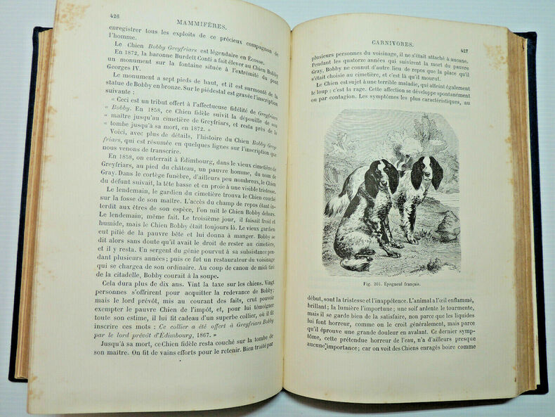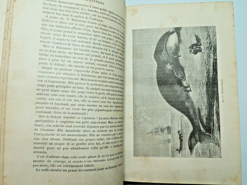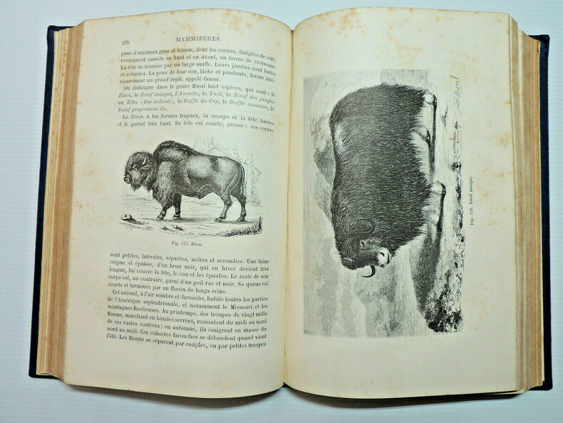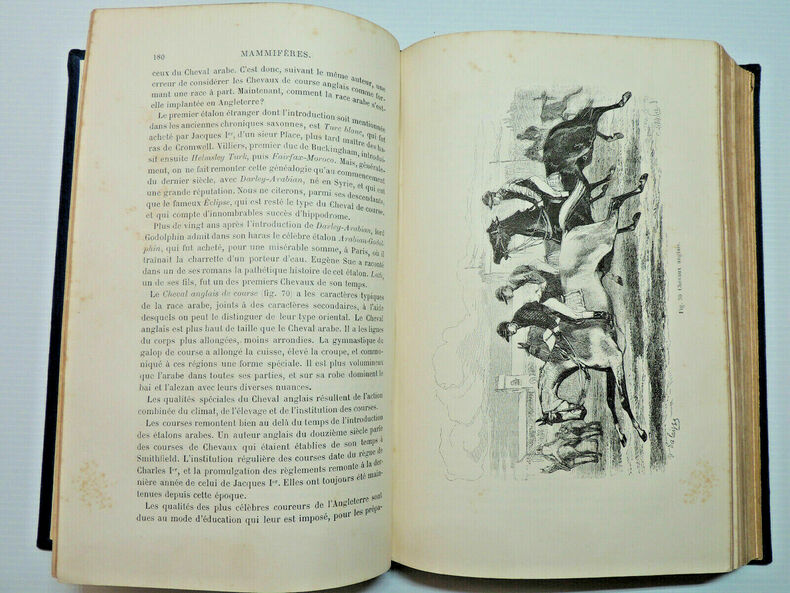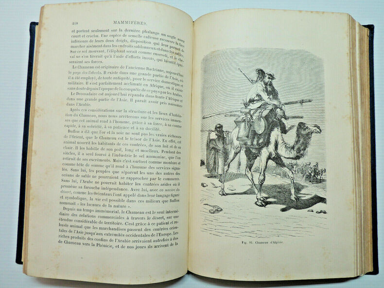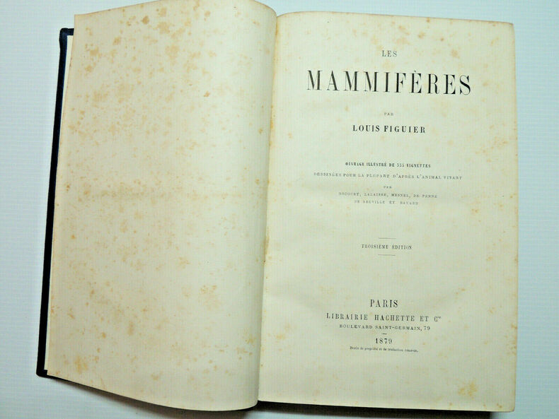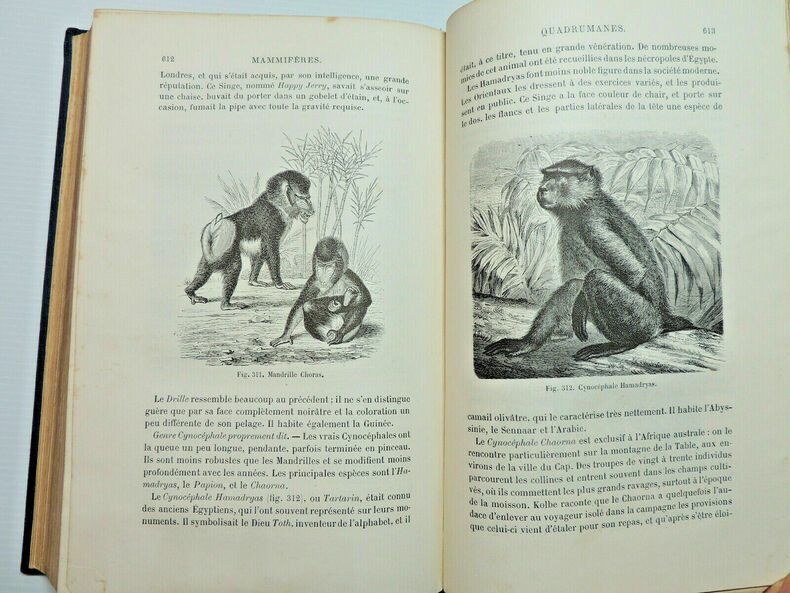 335 vignettes dessinées pour la plupart d' après l' animal vivant par Bocourt, Lalaisse, Mesnel, De Penne, De Neuville et Bayard. Troisième édition. Table; Ordres des: Monotrèmes - Marsupiaux - Cétacés - Amphibies - Pachydermes - Ruminants - Édentés - Carnivores - Rongeurs - Insectivores - Cheiroptères - Quadrumanes. Volume grand in4, 240x150, relié demi chagrin, bon état intérieur, bien frais, 671pp, tranches dorées. Paris, Hachette, 1879