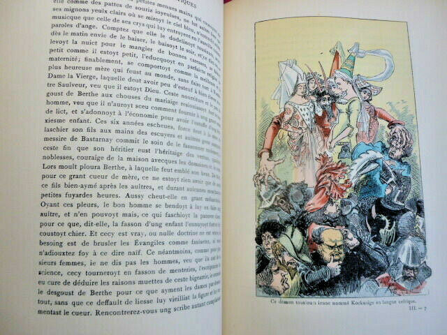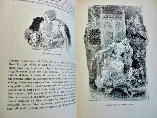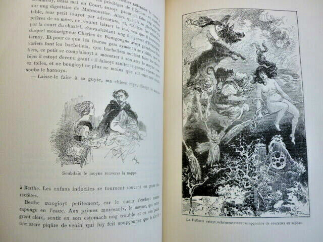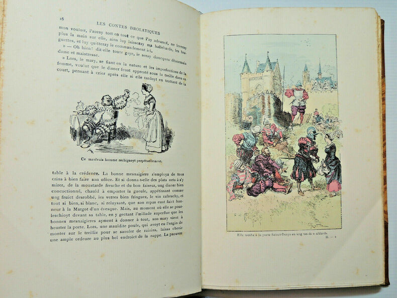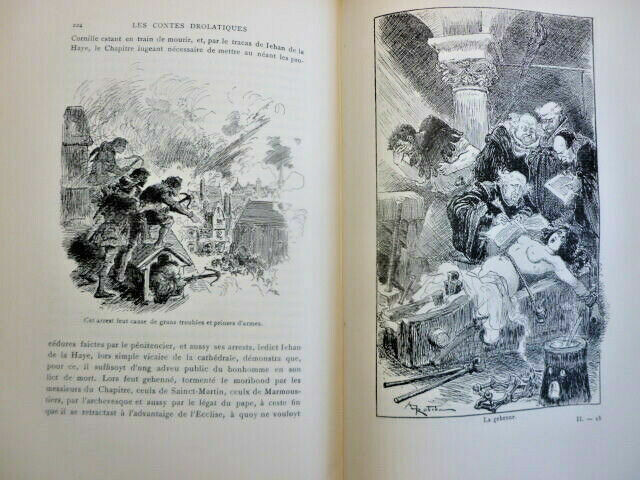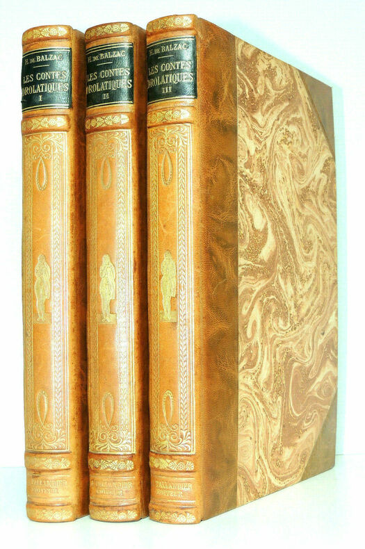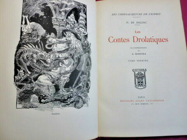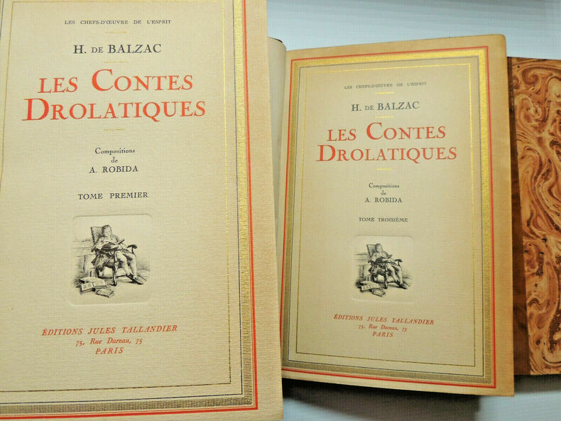 10ème EDITION..........Les Contes drolatiques (30 contes répartis en 3 dizains) ont été publiés en librairie de 1832 à 1837. Le présent exemplaire est une des nombreuses rééditions de la cinquième édition (1855, Bureaux de la Société générale de librairie, Paris) illustrée de 425 dessins par GUSTAVE DORÉ. " Les Contes drolatiques colligez ez abbayes de Touraine et mis en lumière par le sieur de Balzac pour l'esbattement des pantagruélistes et non aultres" sont écrits dans une langue inventée par Balzac, inspirée de Rabelais, faite de mots savants, étrangers, dialectaux, de néologismes et d'archaîsmes qui conte les aventures grivoises voire obscènes de personnages historiques ou inventés. Les XXXI premières pages comprennent la Table des dessins, la Table des matières, l'Avertissement du libraire, la Notice des éditions des Contes drolatiques (jusqu'à la dixième édition de 1884). Intérieur du livre en trés bon état (sans rousseurs, papier non jauni)........superbe......en trés bon état (very good condition).