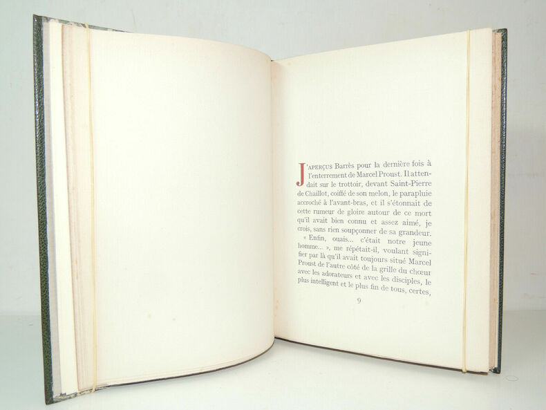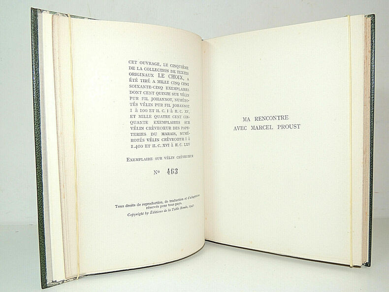 avec un portrait gravé sur bois par Gilbert Poilliot d'après la peinture de Jacques-Emile Blanche vol in-8, 20x15, relié demi cuir à bandes, tranche de tête dorées à l'or fin, dos à nerfs, 148 pp. Couvertures d'origines conservés avec dos, superbe ! Exemplaire sur vélin crèvecoeur numéroté 463 Paris, La Table ronde, Collection " le choix", achevé d'imprimé le 12 novembre 1947 ref/240
