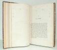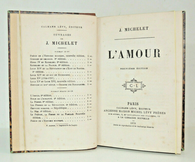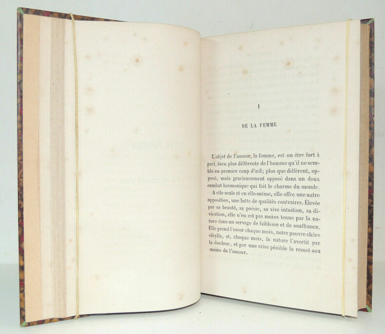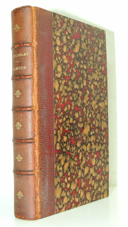 L’objet de l’amour, la femme, est un être fort à part, bien plus différente de l’homme qu’il ne semble au premier coup d’œil ; plus que différent, opposé, mais gracieusement opposé dans un doux combat harmonique qui fait le charme du monde.À elle seule et en elle-même, elle offre une autre opposition, une lutte de qualités contraires. Élevée par sa beauté, sa poésie, sa vive intuition, sa divination, elle n’en est pas moins tenue par la nature dans un servage de faiblesse et de souffrance. Elle prend l’essor chaque mois, notre pauvre chère sibylle, et, chaque mois, la nature l’avertit par la douleur, et par une crise pénible la remet aux mains de l’amour. Table; objet de ce livre - la révélation de la femme - création de l'objet aimé - initiation et communion - de l'incarnation de l'amour - de l'alanguissement de l'amour - le rajeunissement de l'amour - la femme réhabilité et innocentée par la science. Troisième édition, vol. in-8, 18x11, relié demi cuir, frottements, bon exemplaire, bien frais, 464 pages, ex-libris. Paris, Hachette, 1876. ref/205