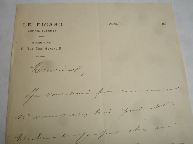 LAS, dimensions 21 cm x 13,5 cm, à l’entête du LE FIGARO Jean Hippolyte Auguste Delaunay de Villemessant, né le 22 avril 1810 à Rouen et mort le 12 avril 1879 à Monte-Carlo, est un journaliste français et patron de journaux dont Le Figaro. " Paris, le...186 , Monsieur, je vous serais reconnaissant si vous voulez bien venir avec.. du papier ...chez moi demain Dimanche de une heure a 4 heure. Il ...3 ... Recevez l'ap.....parfait...............H.A Villemessant."