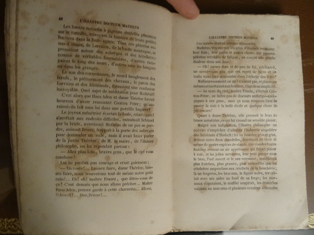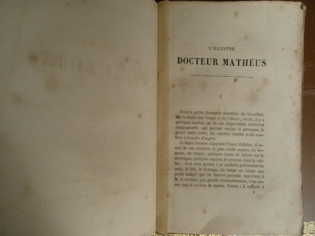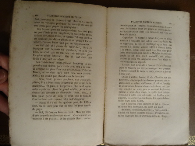 grand in 8 demi-cuir rouge,titre et filets dorés ;texte sur 2 colonnes encadré d’un filet noir;illustrations de Théophile SCHULLER,GLUCK, Emile BAYARD Confidence d’un joueur de clarinette,la taverne du jambon de Mayence, les amoureux de Catherine, Maître Daniel Rock,le tisserand de la Steinbach,184 pages; la maison forestière,les bohémiens,le violon du pendu,72 pages;l’illustre docteur Mathéus ,Myrtille 80 pages,Histoire d’un homme du Peuple, les bohémiens sous la révolution 116 pages;rousseurs éparses habituelles sans lieu ni date ni mention d’éditeur (HETZEL imprimerie Bonaventure et Ducessois)peu courant