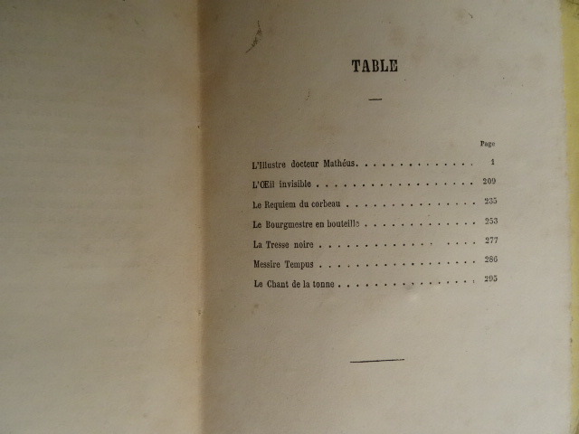 Edition originale de ce recueil de 7 nouvelles, les cinq dernières fantastiques !- L'Illustre Docteur Mathéus ; L'Oeil invisible ou l'Auberge des Trois Pendus ; Le Requiem du corbeau ; Le Bourgmestre en bouteille ; La Tresse noire ; Messire Tempus ; Le Chant de la tonne.Par endroits, l'encre de chine a traversé le papier et sur une planche H.T. elle a fragilisé le papier légèrement fendu. Magistrale illustration de cet ouvrage peu courant avec son style fantastique, par Charles Combe, peintre de Dieulefit qui a illustré dans le texte plusieurs ouvrages du soyeux lyonnais Antonin Duval, célèbre bibliophile de la seconde moitié du XIXe. Reliure bien établie par Bruyère de Lyon. Belle rencontre.