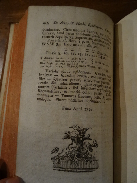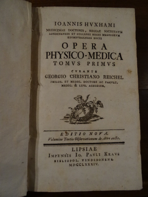 apud Fratres De Tournes, Genevae, 1748-1753. In-4 gr. (mm. 362x220), 9 voll. (su 10), p. pergam. coeva, tit. oro al dorso. L'opera è composta da 6 voll. + 2 Supplementi: il 1° in due parti (1749) - il 2° tre parti in 2 voll. (1753), ed è illustrata da 1 ritratto dell'A. e 3 tavv. inc. in rame. "Manca" la prima parte del 1° Supplemento. Seconda edizione e prima edizione dei Supplementi.<br>Denuò revisa, correcta & aucta, in sex tomos distributa; quibus continentur doctrinae solidis principiis physico-mechanicis & anatomicis.. Cum Vita Auctoris et ejus Praefatione de differente medicinae & medicorum statu atque conditione & criteriis boni ac periti medici.<br>Cfr. Castiglioni, p. 597-8: "Federico Hoffmann (1660-1742), prof. di medicina a Halle, medico a Berlino alla corte di Federico I. Per le sue concezioni meccaniciste cercò di spiegare tutte le funzioni dell'organismo da un punto di vista matematico. Fu soprattutto un chimico e altresi' l'introduttore delle acque minerali nella terapia razionale" - Biographie Médicale,V, p. 257: "précieuse collection" - Morton,72: "Hoffmann of Halle was the most important of the iatromechanists. He believed an ether-like 'vital fluid' to be present in the nervous system and to act upon the muscles, giving them 'tonus'" - Wellcome,III, p. 285 e Blake, p. 217 citano le numer. ediz. a partire dalla prima del 1740<br>Esempl. più o meno pesantem. arross. e fiorito, fori di tarlo margin. su alc. carte di un vol. di Supplemento.