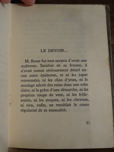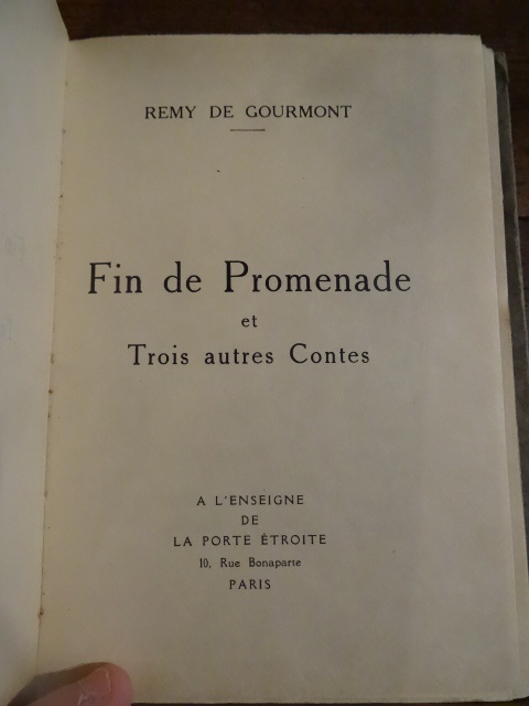 Paris, À l'Enseigne de la Porte Etroite, 1925 ; petit in-16 carré, 52 pp., broché, couverture imprimée. Édition originale, tirée à 650 exemplaires numérotés. Ici, un des 520 exemplaires sur papier vélin d'Arches. Remy de Gourmont a été un écrivain et critique littéraire très brillant, ami de Villiers De l'Isle Adam, Huysmans, Mallarmé et Mirbeau. Défiguré par un lupus, il reste cloîtré chez lui à écrire et ne sort de chez lui que pour se rendre chez son éditeur, le Mercure de France. Bon état.