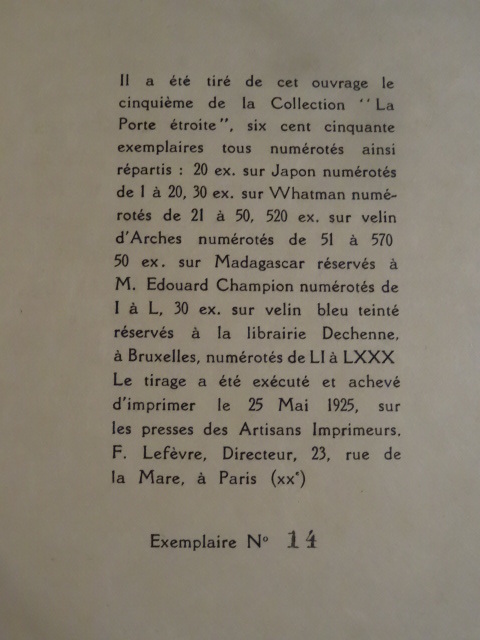 5e volume de la Collection "La Porte étroite".Tiré à 650 exemplaires numérotés, ici exemplaire de passe non numéroté sur vélin d'Arches correspondant aux 520 exemplaires du tirage normal.