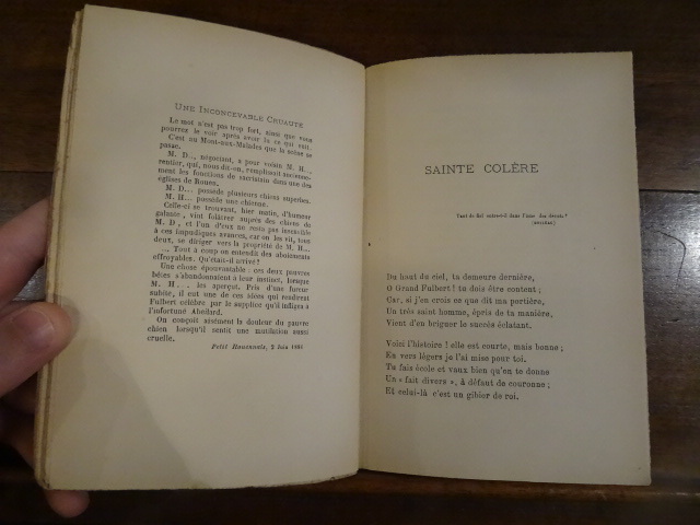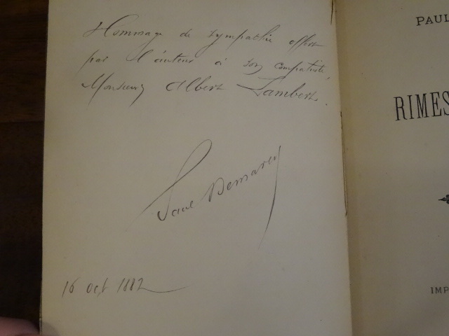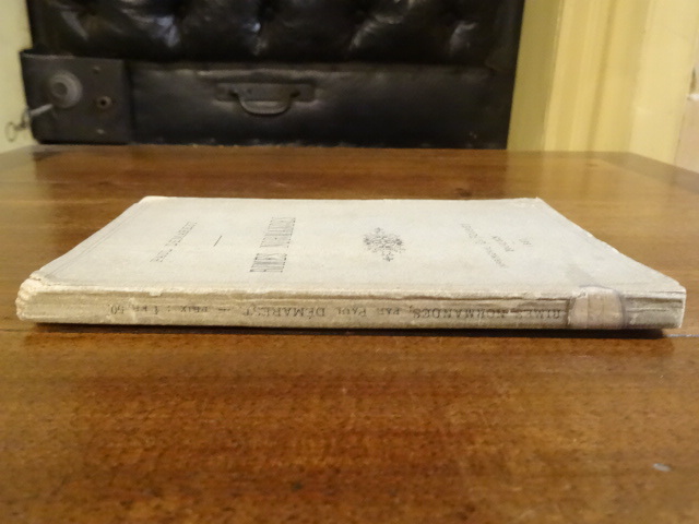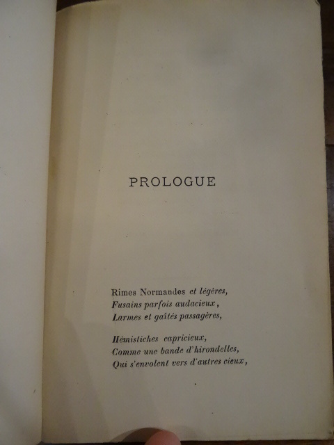 Rouen, Fourey, 1882. In-12, broché, faux-titre, titre, 1 ff non chiffré, 126 pp. Edition originale, envoi de l'auteur daté du 16 octobre 1882 à Albert Lambert. Couverture défraîchie et tachée, manque sur 2 coins et au dos, étiquette collée au dos, papier jauni.