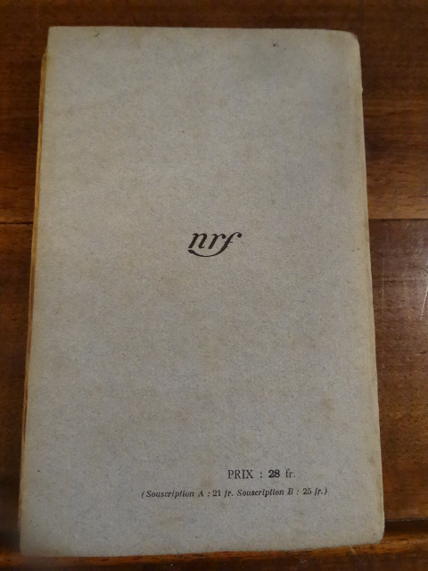 Paris, NRF Gallimard, 1926. In-12, broché couverture rempliée, 225 pp. Edition originale, tirage limité numéroté à 1300 exemplaires, celui-ci étant un des 894 sur vélin pur fil Lafuma-Navarre mais ne portant pas de numéro. Rousseurs sur la couverture, mors fendus en pied et en tête, dos insolé, exemplaire gauchi, rousseurs éparses.