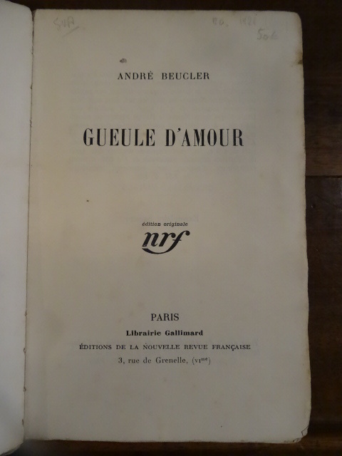 Une femme énigmatique à travers le regard de trois hommes, dont l'un, Gueule d'Amour, est le séducteur séduit. Un roman " fort en gueules " qui fut très librement adapté au cinéma en 1937 par Charles Spaak et Jean Grémillion, mais qui reste néanmoins l'un des rôles les plus populaires de Jean Gabin. André Beucler est une figure de la créativité littéraire de l'entre-deux guerres, son ¿uvre romanesque est très riche (Gueule d'amour porté à l'écran avec Jean Gabin par Jean Grémillon). Grand Prix de la Société des Gens de Lettres pour l'ensemble de son oeuvre, ses souvenirs sont un témoignage indispensable à la connaissance des milieux littéraires des années 20-30, que ce soit à travers ses écrits ou ses productions radiophoniques. vol. relié demi-cuir, 18x120, très bon état intérieur, 225pp. Paris, Gallimard, 1926. Edition Originale. ref/262