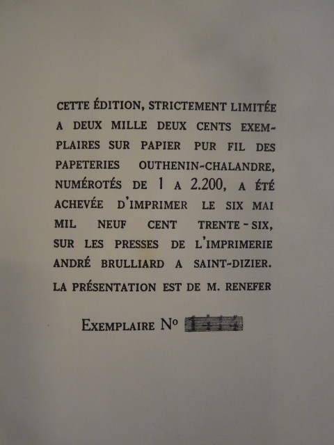 Paris, Flammarion, 1936. In-8 carré, pleine basane racinée époque, dos à nerf, titre doré, plats décorés de 4 larges écoinçons à froid et de filets à froid, 315 pp. Tirage limité numéroté à 2200 exemplaires sur papier pur fil des papeteries Outhenin-Chalandre, celui-ci portant le numéro 1414. Plat supérieur et dos conservés. Dos insolé et un peu frotté, coiffe supérieure frottée, quelques rousseurs.
