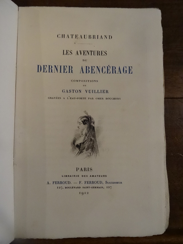 ILLUSTRÉ DE 14 BURINS ET HABILLÉ D'UNE RELIURE MOSAïQUÉE. Édition originale de l'illustration au burin d'Albert Decaris, avec un frontispice en double-page, un grand ornement et 12 compositions à pleine page. Tirage limité à 275 exemplaires sur vélin d'Arches (celui-ci le n°249) dont 25 réservés aux collaborateurs. Les 20 premiers exemplaires comportent une suite sur Japon. François René de Chateaubriand compose cette nouvelle en 1807 alors que, exilé par Napoléon à trois lieues de la capitale, il s'est retiré dans sa résidence de la Vallée-aux-Loups. « Le portrait que jai tracé des Espagnols explique assez pourquoi cette nouvelle na pu être imprimée sous le gouvernement impérial. La résistance des Espagnols à Bonaparte, dun peuple désarmé à ce conquérant qui avait vaincu les meilleurs soldats de lEurope, excitait alors lenthousiasme de tous les coeurs susceptibles dêtre touchés par les grands dévouements et les nobles sacrifices. » (Avertissement). Les Aventures du dernier Abencerage paraît pour la première fois à Londres en 1826, puis dans l'édition des Oeuvres complètes donnée par Ladvocat. L'ouvrage est habillé d'une reliure à décor mosaïqué signée M. Krinbarg. Prix de Rome de gravure formé à l'École Estienne et aux Beaux-arts de Paris, Albert Decaris (1901-1988) réalisa l'illustration de nombreux ouvrages en plus de graver quelque 600 timbres poste.