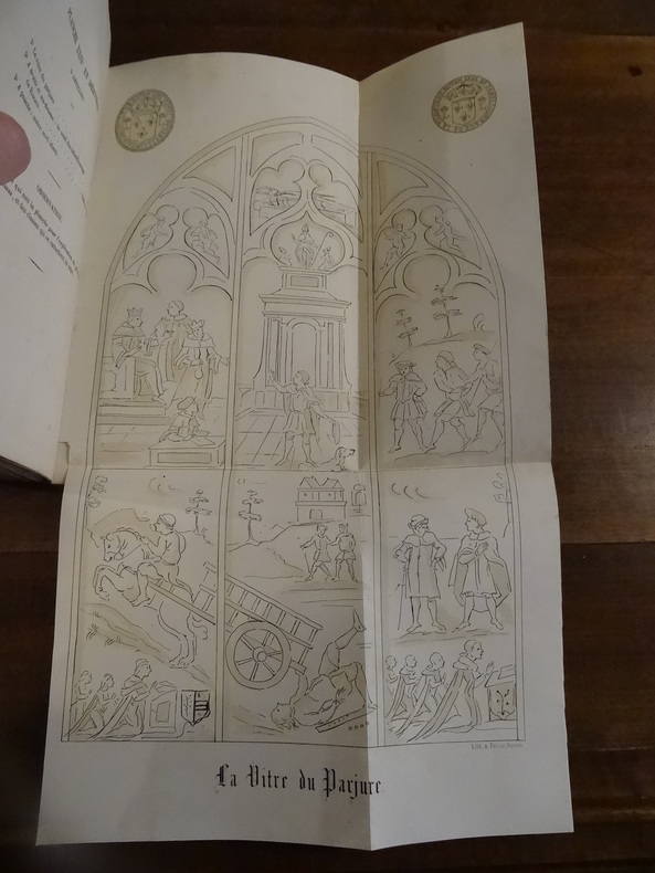 Rouen, Boissel, 1863. In-8, broché, faux-titre, titre, VIII, 577 pp, 1 p non chiffrée (errata). Ouvrage illustré d'un frontsipice, de 24 planches dont 2 en couleurs, contenant 183 sceaux, de 2 gravures hors texte dont 1 dépliante (fac-similé de la charte ducale). Couverture en mauvais état, dos restauré avec de la toile, mouillures sur le plat supérieur, le frontispice et dans la marge inférieure en fin de volume, quelques rousseurs, brochage fragile.