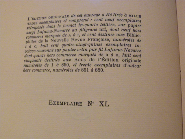 Paris, Nrf, 1927. Petit In-4 broché. 225 pp Edition originale à tirage limité et numéroté à 1003 exemplaires, celui-ci étant l'un des 100 exemplaires du tirage de tête sur vergé Lafuma-Navarre. (n°XL) Rousseurs sur la couverture, papier légèrement jauni sur les bords des pages.