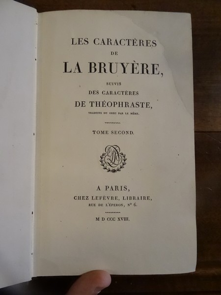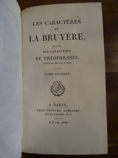 Les Caractères de La Bruyère suivis des Caractères de Théophraste, traduits du grec par le même; précédés d'une notice sur La Bruyère considéré comme écrivain et moraliste par J. Simonnin. (Paris: Emler frères, 1829). [M.C.: Littérature]
