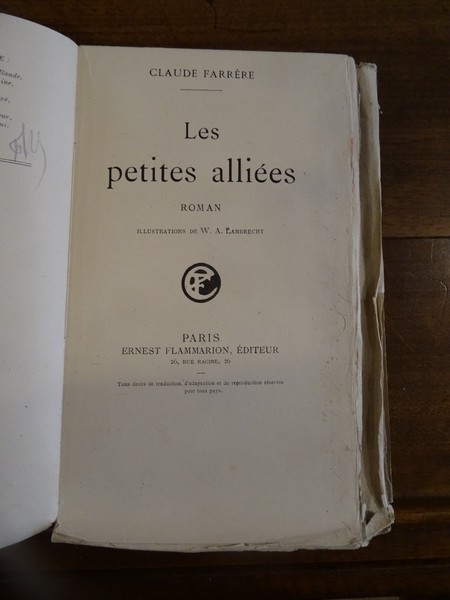 Paris Librairie Paul Ollendorff Sans date (1910). 315 pp. In-12. Relié. Bel exemplaire. 1 volume. ÉDITION ORIGINALE LIMITÉE à 85 exemplaires numérotés. Celui-ciun des 30 exemplaires numérotés sur Japon Impérial, second papier après 5 Chine. Enrichi d'un bel envoi autographe signé sur le faux-titre:«pour mon ami Gomès / en souvenir du temps / où, non loin du camp / de Cercottes, nous / essayâmes, nous deux / et douze ou quinze / bons camarades, de / ressusciter les temps / des Petites Alliées, et / d'élever à cette dignité / de simples petites amies / rencontrées au hasard / de la guerre, ?nous / essayâmes, hélas, en /vain?/ et avec mon amitié / Farrère / mai 1918». Le roman se passe à Toulon, dans un univers de jeunes officiers de marine qui se divertissent avec des demi-mondaines.
