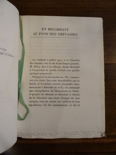 Edition originale. 1 des 30 exemplaires numérotés sur Japon, seul grand papier. Réunion de 7 articles de Maurice Barrès, attaquant Louis Malvy, ministre de l'Intérieur, en l'accusant d'espionnage et de trahison au profit de l'Allemagne. Il démissionnera en septembre 1917.