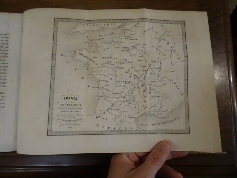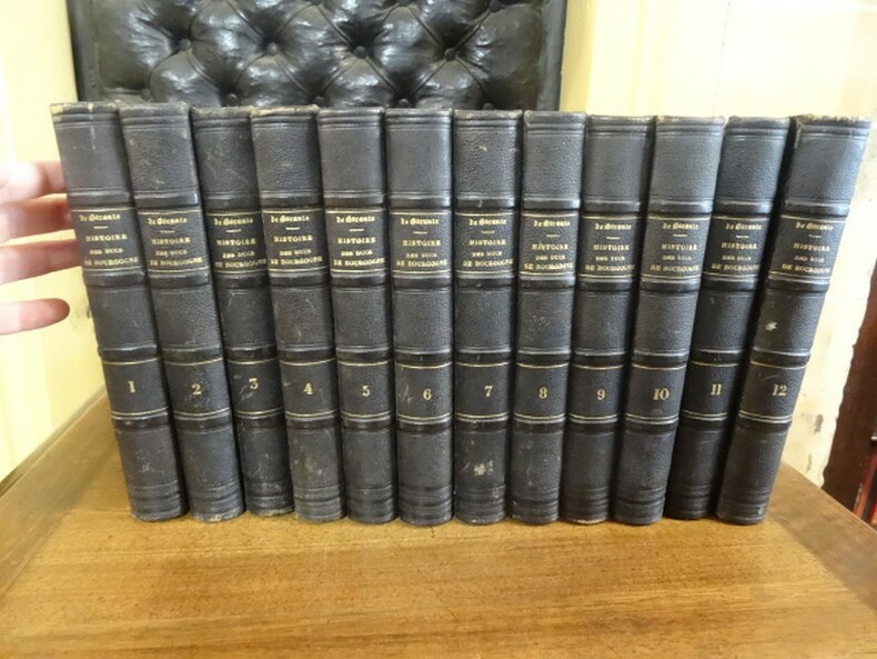 Histoire des Ducs de Bourgogne de la maison de Valois 1364 - 1477 Couverture rigide 6 volumes in-8, 12 tomes 12 cartes dépliantes, très nombreuses gravures sur bois et cartes hors-texte. Reliure demi chagrin vert, dos à nerfs orné de nombreux filets d'encadrement avec au devant l armorial d'Anvers, coin frotte, le dernier volume contient une importante table des matières. (rousseurs, certains feuillets roussis) Tome I :420 pp Tome II :430 pp Tome III : 418 pp Tome IV : 434 pp Tome V : 432 pp Tome VI : 439 pp Tome VII : 415 pp Tome VIII : 418 pp Tome IX : 448 pp Tome X : 448 pp Tome XI : 446 pp Tome XII : 465 pp