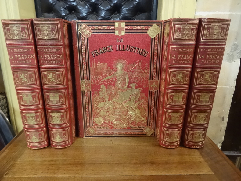 Paris, Jules Rouff, Editeur, 1881, in-4, demi-reliure, La France illustrée. Géographie - Histoire - Administration - Statistique. Illustrations par les premiers artistes. Illustrations par Hubert Clerget pour les tomes 4 et 5. Cartes et Plans gravés par Erhard. 5 volumes (sans Atlas). De menues rousseurs, surtout en marge. Bon état général.