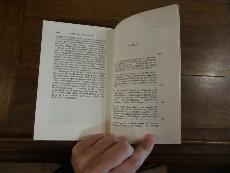 Paru initialement en 1957, il est réédité en 1972 par les éditions André Sauret dans la collection ˮPrix Littéraire Prince Pierre de Monacoˮ dans une belle édition soignée, numérotée, illustrée et reliée en pleine basane maroquiniée rouge avec motifs or au dos et sous emboitage, tranche de tête dorée. Préface de Pierre Mazars. Illustrations de Commère. Récits sur la voile et les plaisanciers avec humour et une grande part de dérision. ˮO capitaine graillonneux et radoteur ! vous raisonnez en gardien de cimetière. Vous faites de la plaisance archéologique. La tradition n'est pas un reliquaire. Vous traitez la voile comme un accessoire d'exhibition folklorique, vous naviguez sur un bateau fossile.ˮ ˮParadoxalement ce livre qui a enchanté, enchante et enchantera tous les marins qu'ils soient de plaisir ou de métier n'est pas un livre sur la mer. Le sujet c'est l'amitié. Deux hommes sur un bateau.ˮ (François Brigneau)