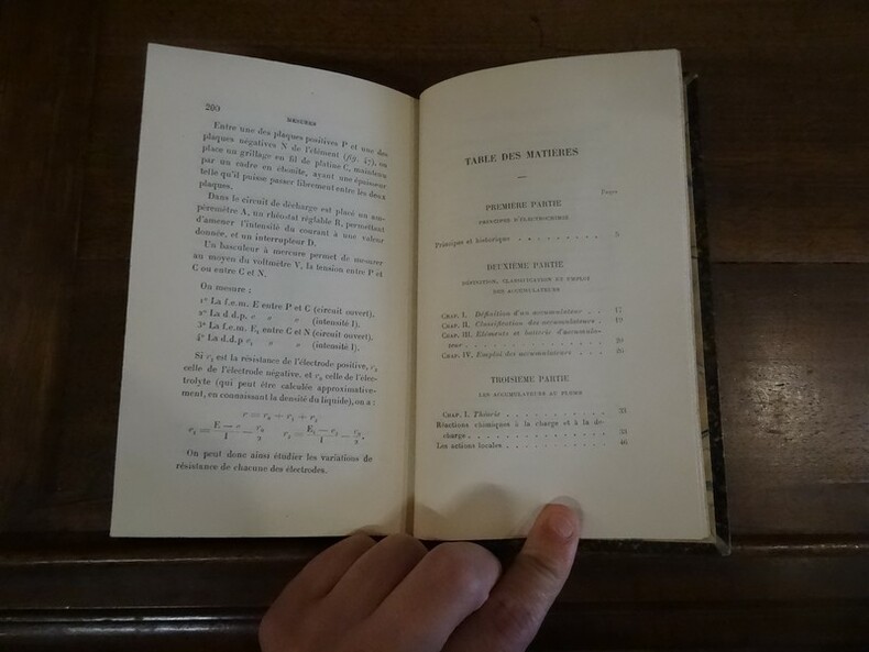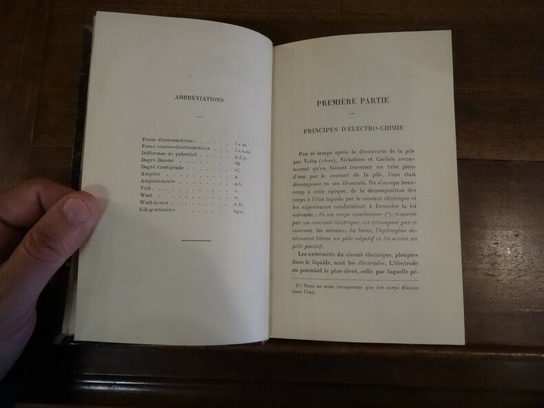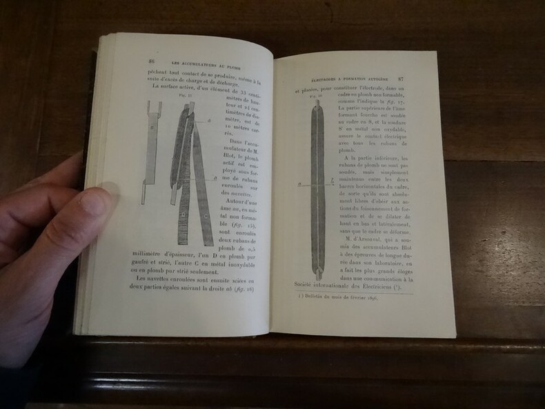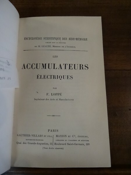 222 figures dans le texte en noir et blanc 1ere édition, 1927 Contents, Chapitres : Avertissement - 1. Définitions et généralités - Théorie chimique de l'accumulateur au plomb - Propriétés de l'accumulateur au plomb - Etude descriptive de l'accumulateur, plaques - Principales marques françaises d'accumulateurs au plomb - 2. Applications des accumulateurs : Emploi des accumulateurs pour constituer une réserve d'énergie dans les stations centrales - Batteries-tampon - Fonctionnement des batteries - tampon combinées avec des survolteurs-dévolteurs automatiques - Notes sur la construction et le montage des survolteurs - dévolteurs automatiques pour batteries-tampon - Installation et montage des batteries stationnaires - Conduite et entretien des batteries - Batteries transportables - Mesures et essais - Accumulateurs au fer-nickel couverture propre, avec d'infimes traces de pliures discretes, intérieur propre, papier un peu jauni, la dernière page du volume dans la table des matière est un peu déchirée avec un léger manque de texte, cela ne concerne que la table, le texte en lui-même et complet