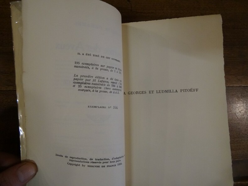 Paris, mercure de France, 1924. In-12 broché. 206 pp. Edition Originale à tirage limité et numéroté à 940 exemplaires. Celui-ci étant un des 195 sur vélin de Rives numéroté 104. Bel état.