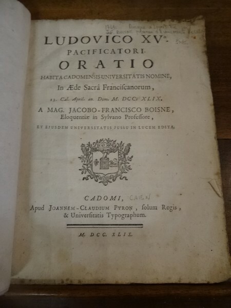 Cadomi (Caen), Pyron, 1749. Plaquette in-4, broché sous couverture d'attente. 23 pp. Le plat inférieur a été remplacé par un feuillet de papier épais, mouillures sur l'ensemble de l'ouvrage.