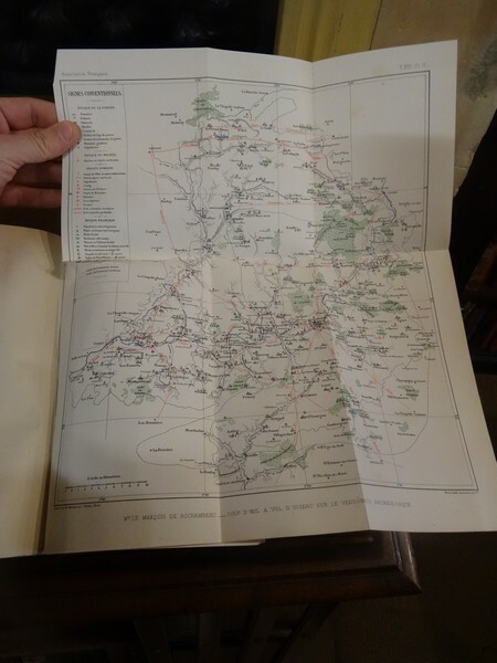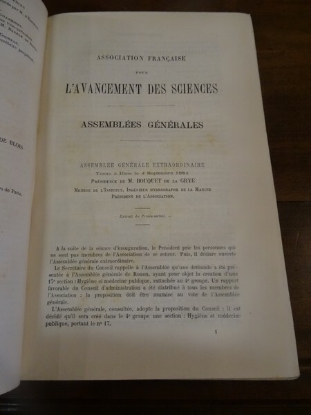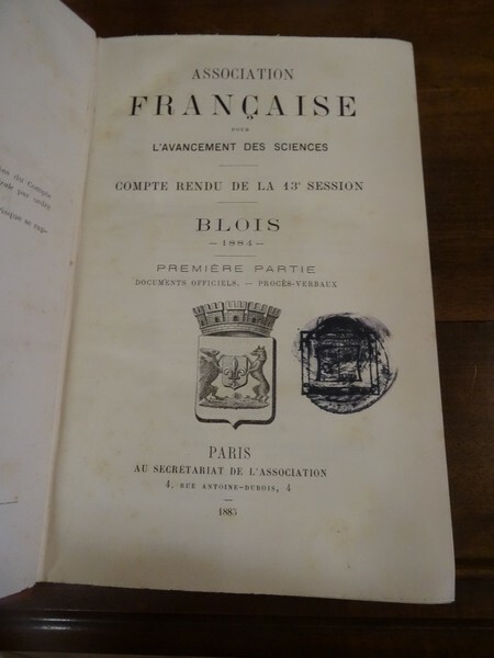 Paris, Au secrétariat de l'association, 1885. 2 parties en 1 fort volume in-8, percaline éditeur, titre et date en noir au dos et sur le plat supérieur, armes de la ville de Blois en noir sur le plat supérieur. Faux-titre, titre, CII, 338 pp; faux-titre, titre, 791 pp. Ouvrages illustré de figures in-texte, d'un tableau synoptique dépliant et de 12 planches in-fine. Coins tordus, coiffes affaissées et légèrement frottées, taches au plat inférieur, quelques rousseurs, mouillure claire dans la marge supérieure.