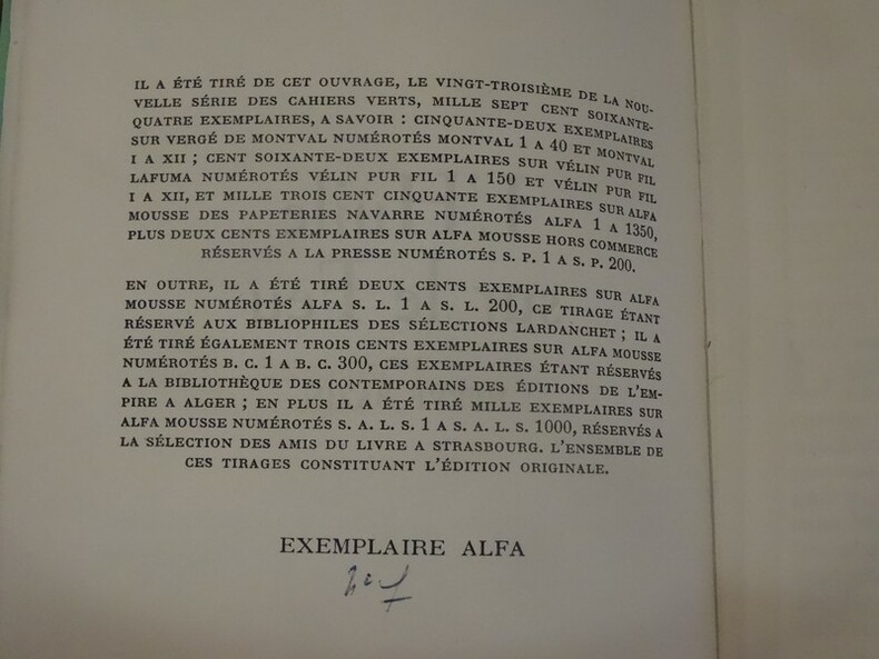 Paris, Bernard Grasset, 1954. In-12 broché sous couverture rempliée verte. 331 pp, 1 f. d'achever d'imprimer. Edition originale à tirage limité et numéroté à 1764 exemplaires. Celui-ci étant un des 1350 sur Alfa. Pliures au dos, sinon très bel état.