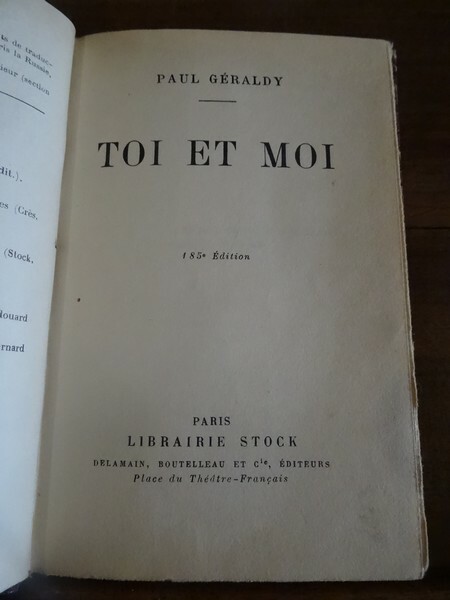 volume in-8, 20x13, 164 pages, sous couvertures rempliées, petites usures d'usage, bel état. Numéroté sur papier pur fil Outhenin Chalandre, 294/2200 Flammarion, 1931 Toi et moi Si tu m'aimais, et si je t'aimais, comme je t'aimerais ! "Paul Géraldy (1885-1983), poète français, est l'auteur de vers intimistes. Toi et moi, paru pour la première fois en 1913, a connu un succès considérable. Aujourd'hui encore, il demeure le livre de chevet de tous les amoureux." "Toi et Moi" est un recueil de poèmes de l'écrivain français Paul Géraldy, publié en 1912. Paul Géraldy, de son vrai nom Paul Lefèvre, était un poète et dramaturge français. "Toi et Moi" est considéré comme l'œuvre la plus célèbre de Paul Géraldy. Il s'agit d'un recueil de poèmes dédié à l'amour et aux relations amoureuses. Les poèmes explorent les différentes facettes de l'amour, depuis les premiers émois jusqu'aux joies et aux peines de la vie à deux. Les poèmes de "Toi et Moi" sont souvent empreints de sensualité et de romantisme. Ils expriment les sentiments intenses ressentis dans une relation amoureuse et explorent les thèmes de l'intimité, de la passion et de la complicité. Paul Géraldy était connu pour son style élégant et émotionnel. Ses poèmes sont empreints de lyrisme et de délicatesse, capturant les émotions les plus subtiles de l'amour. "Toi et Moi" a connu un grand succès à sa sortie et a été très apprécié par le public. Les poèmes de ce recueil ont souvent été cités et repris dans d'autres œuvres littéraires, et certains sont même devenus des classiques de la poésie amoureuse française. "Toi et Moi" reste une référence dans le domaine de la poésie amoureuse et continue d'être lu et apprécié par les amateurs de poésie romantique. ref/1