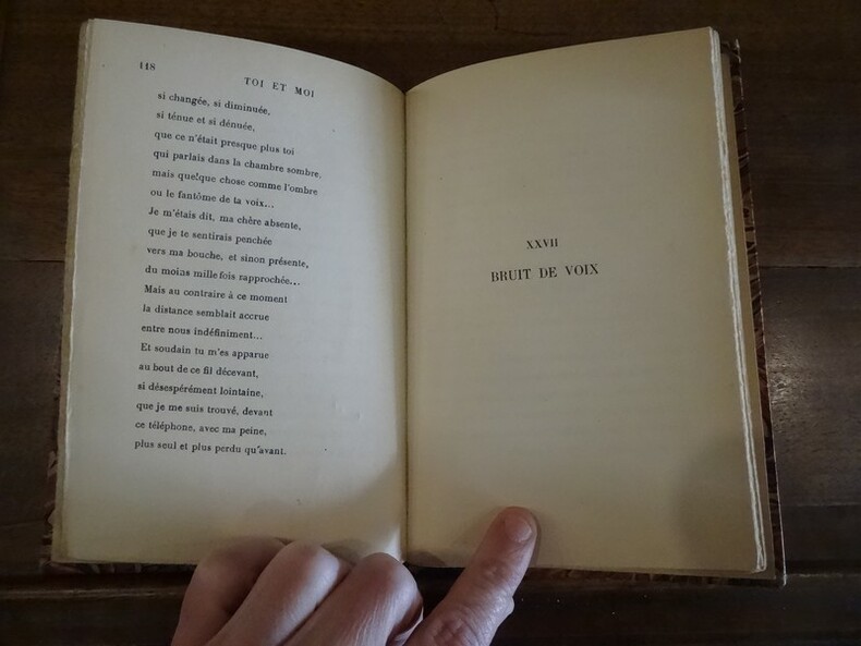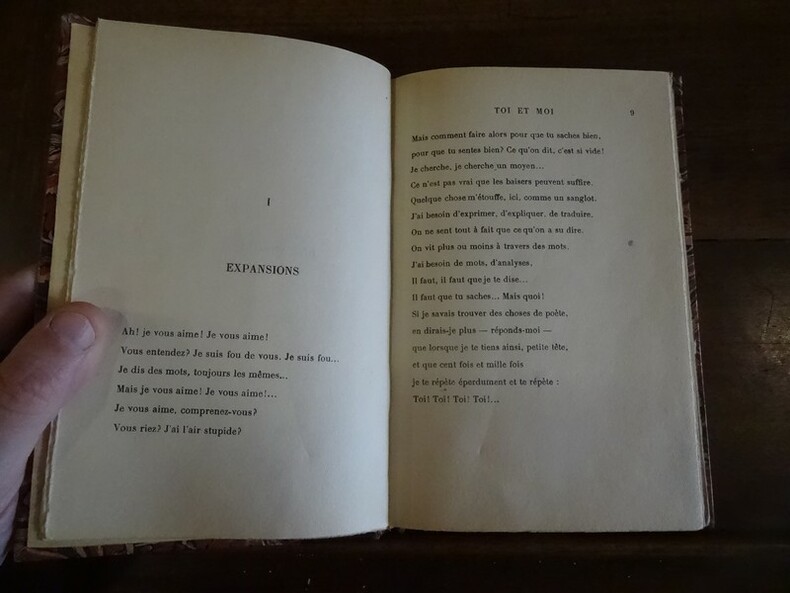 Nouvelle édition, 2 dessins de Edouard Vuillard vol relié, jolie reliure demi cuir, 210x145, état neuf, couvertures d'origines conservées avec dos, 172pp. Exemplaire numéroté. Paris, Cres & Cie, 1923 "Toi et Moi" est un recueil de poèmes de l'écrivain français Paul Géraldy, publié en 1912. Paul Géraldy, de son vrai nom Paul Lefèvre, était un poète et dramaturge français. "Toi et Moi" est considéré comme l'œuvre la plus célèbre de Paul Géraldy. Il s'agit d'un recueil de poèmes dédié à l'amour et aux relations amoureuses. Les poèmes explorent les différentes facettes de l'amour, depuis les premiers émois jusqu'aux joies et aux peines de la vie à deux. Les poèmes de "Toi et Moi" sont souvent empreints de sensualité et de romantisme. Ils expriment les sentiments intenses ressentis dans une relation amoureuse et explorent les thèmes de l'intimité, de la passion et de la complicité. Paul Géraldy était connu pour son style élégant et émotionnel. Ses poèmes sont empreints de lyrisme et de délicatesse, capturant les émotions les plus subtiles de l'amour. "Toi et Moi" a connu un grand succès à sa sortie et a été très apprécié par le public. Les poèmes de ce recueil ont souvent été cités et repris dans d'autres œuvres littéraires, et certains sont même devenus des classiques de la poésie amoureuse française. "Toi et Moi" reste une référence dans le domaine de la poésie amoureuse et continue d'être lu et apprécié par les amateurs de poésie romantique. ref/18