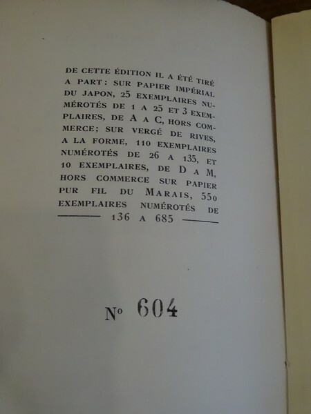 Paris, Stock, 1924. In-12, broché. 341 pp, 2 pp non chiffrées. Edition définitive en partie originale, tirage limité numéroté à 685 exemplaires, celui-ci étant un des 550 sur pru fil du Marais, portant le numéro 604. Ouvrage illustré de 63 compositions en noir de l'auteur. Exemplaire partiellement non coupé. Dos et plats supérieur insolés, sinon très bon état.