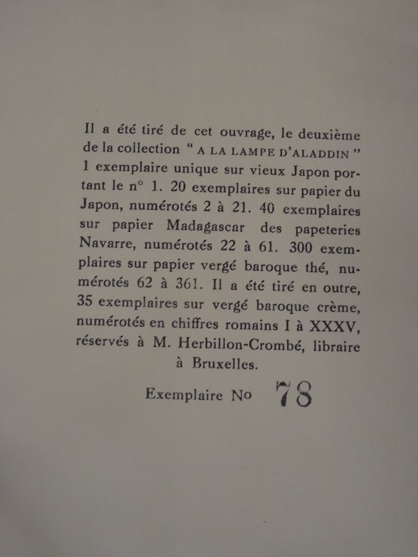 Liège, A la lampe d'Aladdin, 1926. In-16 carré, broché, couverture rempliée. 66 pp. Edition originale, tirage limité numéroté à 361 exemplaires, celui-ci étant un des 300 sur papier vergé baroque thé, portant le numéro 78. Très bon état.