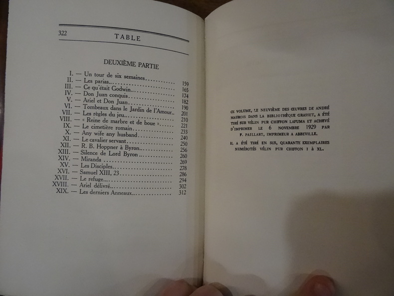 Paris, Grasset, 1929. In-8, demi chagrin à coins, dos à un gros faux-nerf, orné de filets à froid, titre doré, tranche supérieure dorée. 322 pp. Exemplaire sur vélin pur chiffon, portant le numéro D 184, couvertures conservées. Tome IX des oeuvres de Maurois. Très léger frottements sur la coiffe supérieure, sinon très bon état.