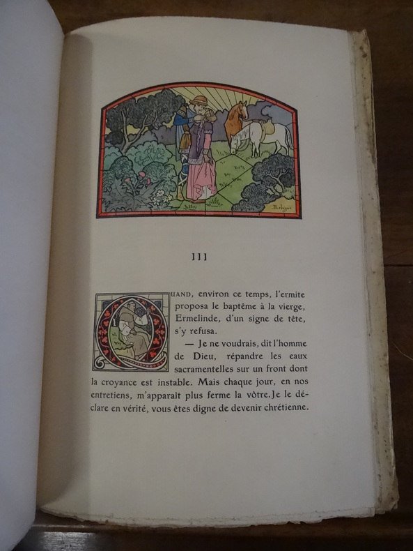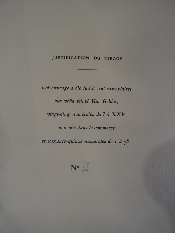 Paris, Blaizot, 1920. In-8, broché couverture rempliée, plats illustrés en couleurs, faux-titre, 1 f non chiffré, titre, 2 ff non chiffrés, 60 pp, 1 p non chiffrée. Tirage limité numéroté à 100 exemplaires sur vélin teinté Van Gelder, celui-ci portant le numéro 62. Ouvrage illustré de nombreuses compositions en couleurs, dont une en frontispice par Léon Lebègue. Couverture piquée et insolée, fente au mors supérieur, quelques rares rousseurs.