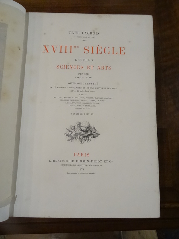 Paris, Firmin-Didot, 1878. In-4 en demi-chagrin rouge au dos à faux nerfs orné de fleurons dorés. Tranche supérieure dorée. Faux-titre, titre, xiii, 560 pp. Illustré de 16 chromolithographies et 250 gravures en noir in et hors texte d'après Watteau, Vanloo, Largillière, Boucher, Lancret, Greuze, Chardin, Desportes, Oudry, Vernet, La Tour, Les Saint-Aubin, Gravelot, Cochin, Eisen, Moreau, Marillier... Frottements aux coins et rousseurs éparses sinon bon état.