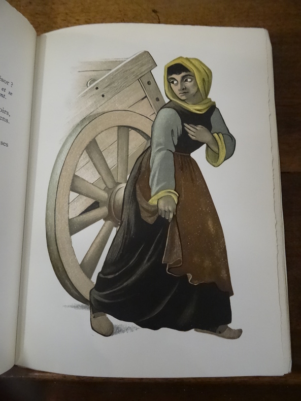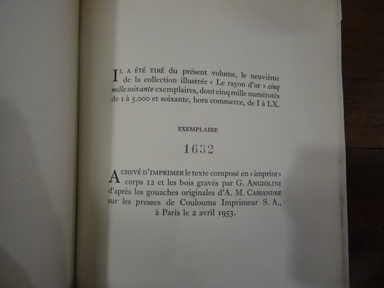 Paris, Le rayon d'or, 1953. In-8, broché, couverture rempliée, 235 pp. Tirage limité numéroté à 5000 exemplaires, celui-ci portant le numéro 1632. Ouvrage illustré de 12 gouaches hors texte par A.M. Cassandre, gravées sur bois par G. Angiolini. Dos et plats partiellement jaunis, taches marrons dues à du scotch et écritures au stylo sur les pages de garde.