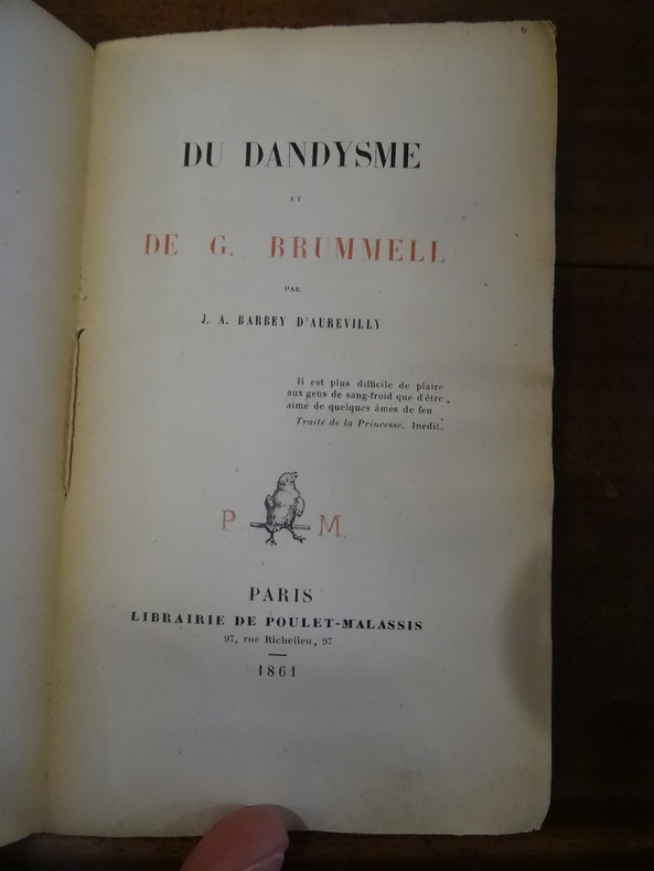 BARBEY d'AUREVILLY Jules, Du Dandysme et de Georges Brummell. à Paris, Alphonse Lemerre éditeur, 1879. Exemplaire relié (155x95mm) demi-chagrin brun à coins, 1f en frontispice le portrait de Barbey d'Aurevilly gravé par Martinez, (x, dédicace à César Daly et Préface), 1f portrait de Georges Brummell gravé par Martinez, 127 pages. Couverture supérieure conservée. Troisième édition. Barbey d'Aurevilly est considéré comme l'un des grands dandys du XIX° siècle avec Georges Brummell, Charles Baudelaire et Oscar Wilde. ''Il n'était propre à être rien de plus, mais aussi rien de moins que le plus grand Dandy de son temps et de tous les temps. Plus spirituel ou plus passionné, c'était Shéridan ; plus grand poète, c'était lord Byron ; plus grand seigneur, c'était lord Yarmouth..Le dandysme est toute une manière d'être, et l'on n'est pas que par le côté matériellement visible. Le dandysme résulte de cet état de lutte sans fin entre la convenance et l'ennui.'' (extrait). Bonne condition.